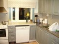 В коттедже 1 спальня с двуспальной кроватью. Кухня-студия, оборудованная всем необходимым для автономного проживания (четырехконфорочная электроплита, холодильник, посудомоечная машина, чайник, кофеварка, набор посуды, микроволновая печь). В гостиной - раскладной диван, МР3 плейер. На первом этаже туалет, совмещенный с душем, электросауна. В сауне и душевой – теплые полы. Вода из собственного колодца. Бойлер на 160 литров.